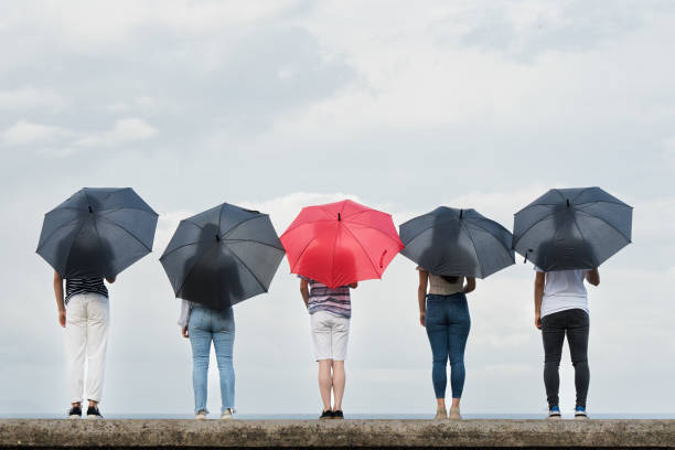 Person with red umbrella standing out from crowd. Rear view of people looking seascape